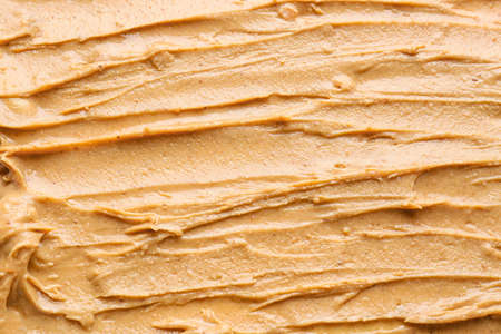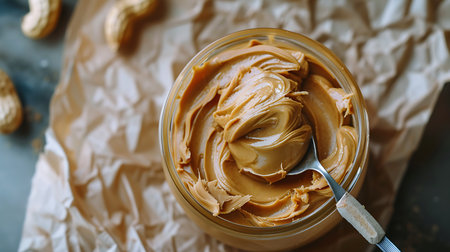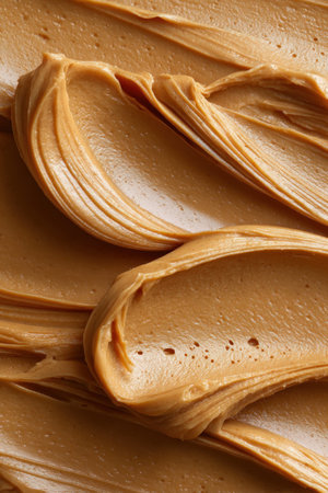 Close up of creamy peanut butter showcasing its smooth, rich texture, perfect for spreading on bread or using in various recipes