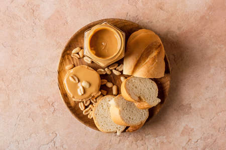 Peanut butter toast with jar of spread, nuts and knife on a plate on a light background. Concept of nutritious and healthy snacks for an American breakfast. Top view, copy space.