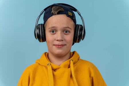 Young boy wearing a yellow hoodie and headphones, smiling against a light blue background, showcasing a casual and modern style with a playful expression