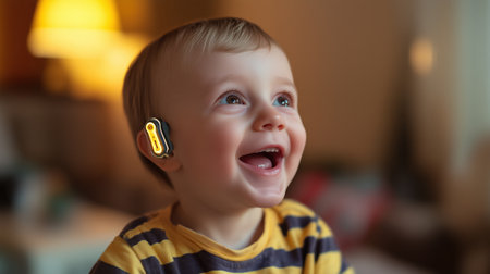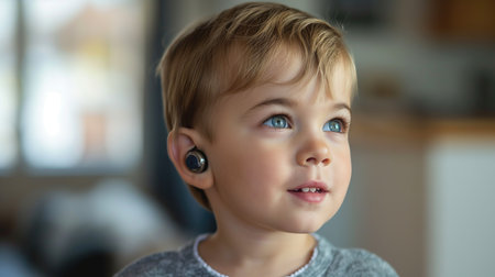 Portrait of cute little boy with a hearing aid. Concept people with health features