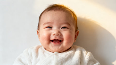 A close-up shot captures a baby with a wide, genuine smile. The baby's skin appears smooth, with bright eyes and a visible open mouth. The scene is lit with soft, diffused light, suggesting an indoor setting. This image could be used for various commercial and editorial purposes.
