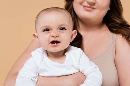 Smiling brunette mother holding baby daughter isolated on beige