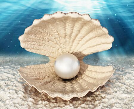 Oyster with a giant pearl standing on sea bed. 3D illustration.