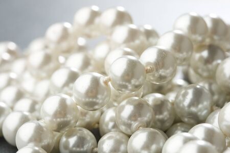 Precious cute pearl beads on wooden rustic background.