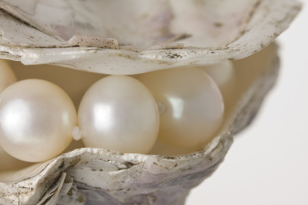 Lustrous pearl nestled among smaller pearls in an oyster shell