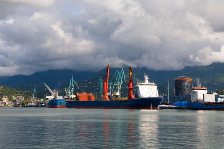 Batumi, Georgia, September 11, 2018: Ships stand in the port on the pier against the background of mountains.