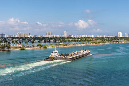 Miami, FL, United States - April 27, 2019: Tug boats helping the platform to navigate in Miami port. The busy Miami Main Channel water traffic in Miami, Florida, United States of America.