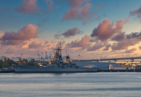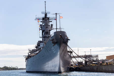 Pearl Harbor, April 16, 2016: Frontal view of the USS Missouri, seen from the USS Arizona Memorial. The USS Missouri symbolizes the end of the 2nd World War, with the signing of the capitulation of Japan.