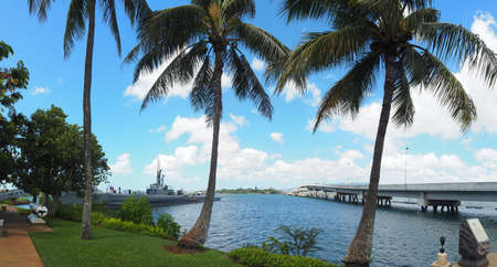 USA, HAWAII - AUGUST 31, 2018:USA, HAWAII - AUGUST 31, 2018: USS Bowfin Submarine and Admiral Clarey Bridge, also known as the Ford Island Bridge in Pearl Harbor