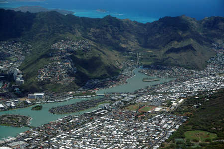 Aerial view of Kuapa Pond, Hawaii Kai Town, Windward coast, clouds and Pacific Ocean on Oahu, Hawaii.