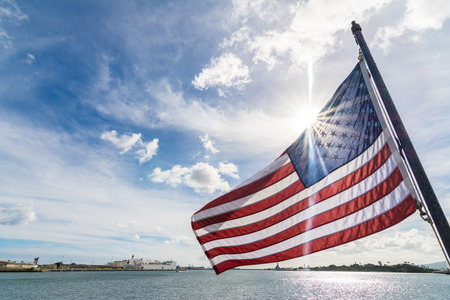 HONOLULU, OAHU, HAWAII, USA - AUGUST 21, 2016: American Flag on USS Bowfin Submarine SS-287. Pearl Harbor historic landmark, patriotic symbol and memorial of the Japanese attack in WW II.
