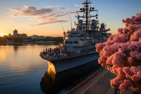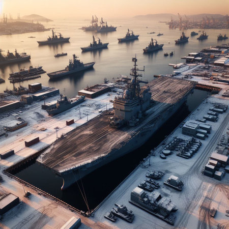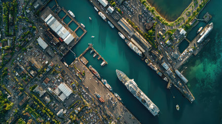 Aerial view of a serene harbor at sunset with palm trees and naval ships docked