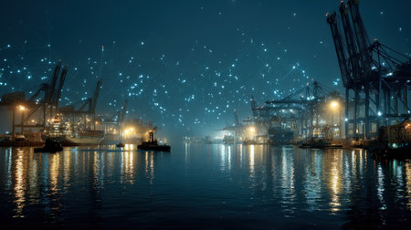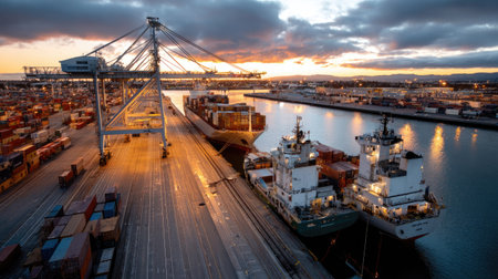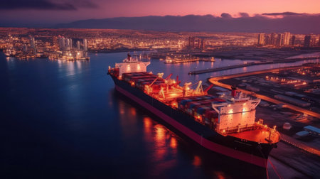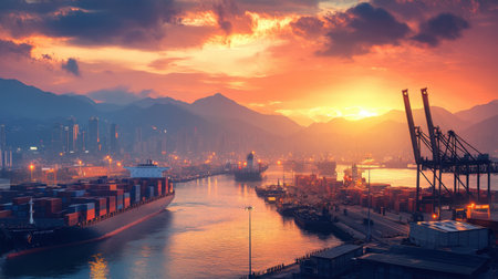 Container Cargo freight ship with working crane bridge in shipyard at dusk for Logistic Import Export background