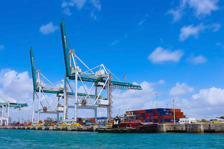 Miami, Florida - February 04, 2025: Freight container of cargo. Port of Miami. Container loading. Export and import. Cargo business. Cargo services with container in Miami port, transportation