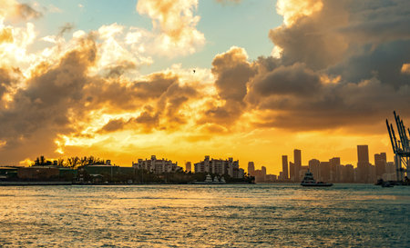 Miami, Florida - February 11, 2025: Aerial Miami port with cargo container. Export and import. Port of Miami. Cargo ship loaded with container in Miami, aerial. Freight container. Cargo capacity