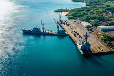 A US military cargo ship at port in Pearl Harbor, Hawaii