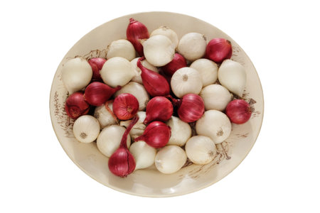 Onion in a ceramic plate isolated on white background. Salad purple and white onion in village bowl. Harvest.