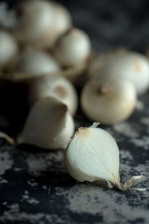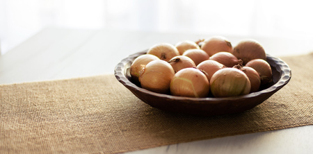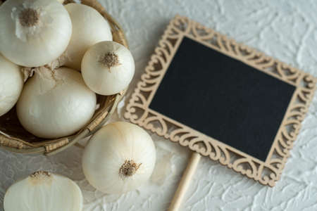 Onions in a wooden bowl with small black board on textured background. Food Ingredients.