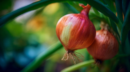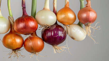 A stunning collection of various fresh onions, showcasing their vibrant colors and unique shapes, ideal for culinary and food photography. Perfect to enhance any kitchen setting.