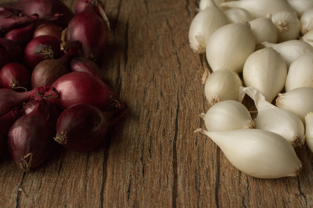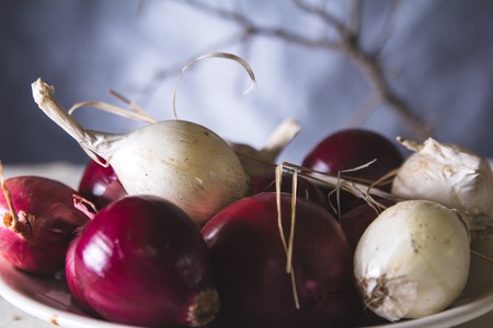 Red and white onion bulbs in the plate an old wooden painted table. Still life