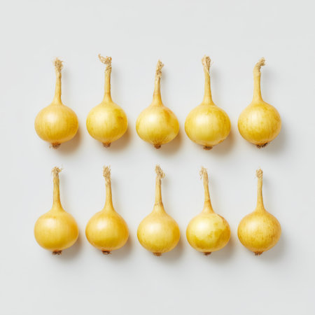 This image showcases fresh yellow onions arranged neatly in a row against a light background, ideal for food-related projects, menus, and cooking visuals.