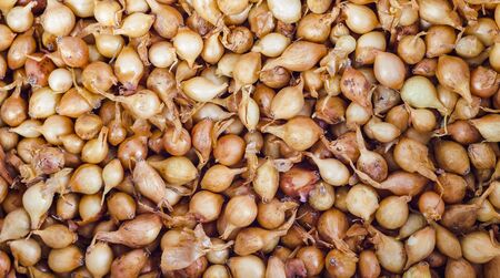 Small yellow onions are ready for planting in the ground for a rich harvest. Spring, gardening concept.