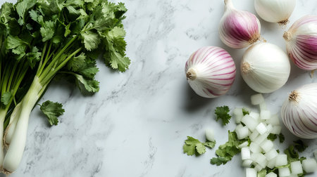 A collection of fresh onions, including red and white varieties, alongside garlic cloves, resting on a countertop near vibrant green herbs, highlighting healthy ingredients for cooking.