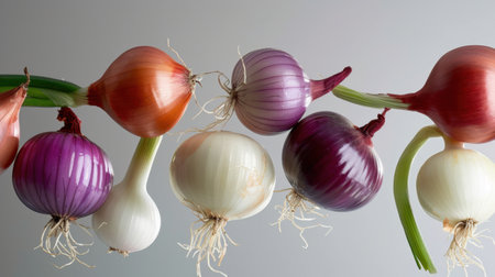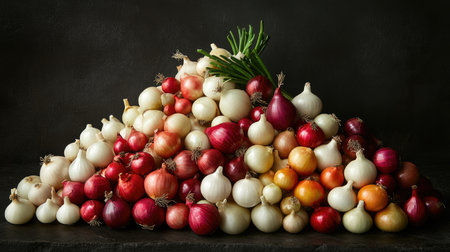 A stunning display of various onions, showcasing their vibrant colors and unique textures. Perfect for food photography, cooking inspirations, or organic produce themes.