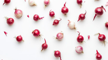 A scattered arrangement of small red onions, showing their varying textures and natural beauty on a clean white background.