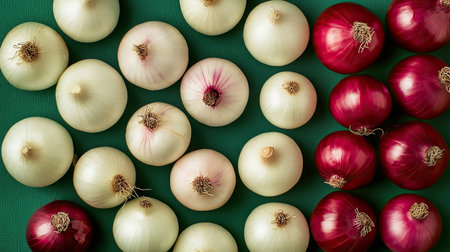 A collection of fresh red and white onions arranged on a vibrant green background. Ideal for culinary and food photography projects, showcasing healthy ingredients.