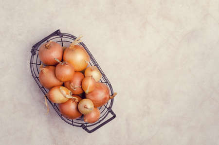 Fresh yellow onions in a metal basket on a light background. top view. A copy of the space.