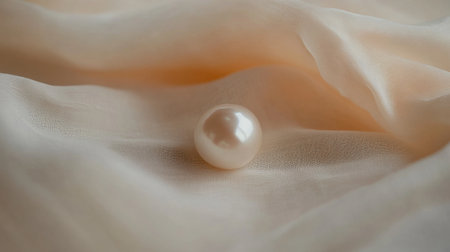 A stunning pearl resting on soft silk fabric, showcasing elegance and luxury. The play of light on the smooth surface creates a serene and artistic atmosphere.