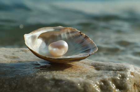 An exquisite pearl rests in an open oyster shell atop a rocky surface, highlighting the beauty of nature and luxury. A serene composition of organic elegance.