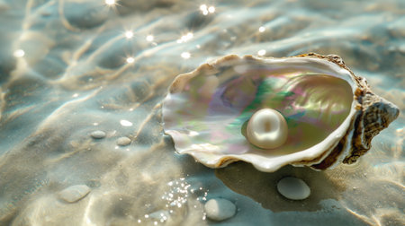 Close-up of a pearl in an oyster shell on the beach with water lapping at the edges