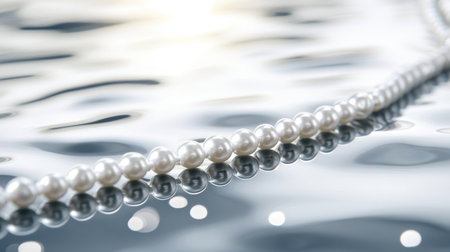 A stunning close-up of an elegant pearl necklace resting on a smooth water surface, showcasing its beautiful reflections and soft highlights, perfect for beauty and fashion themes.