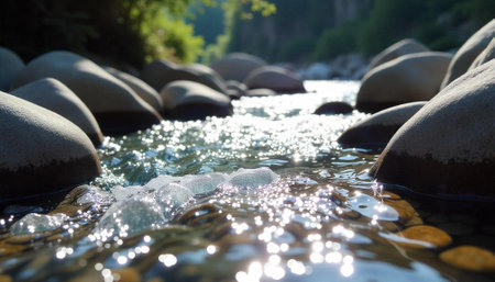 Sunlit river flowing around smooth stones in nature