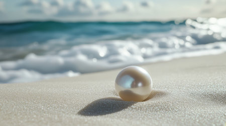 A close-up of a single pearl resting on a bed of white sand, with the ocean waves gently lapping in the background.