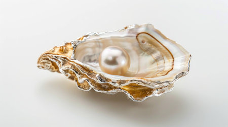 Beautiful open oyster with a shimmering pearl inside, showcasing natural elegance and marine life in a soft, neutral background.