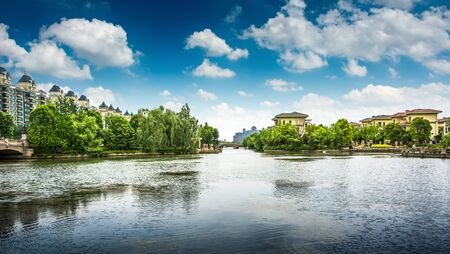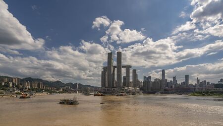 Landscape town background. Beautiful cityscape and skyline with river and skyscrapers. Shenzhen, China.