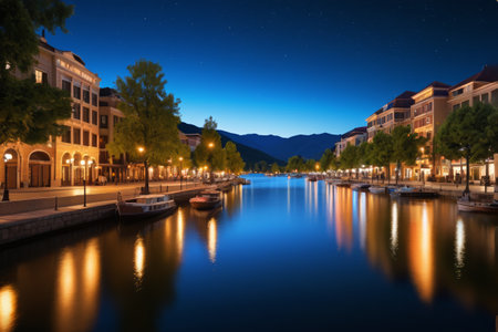 Riverside night view buildings and moored boats