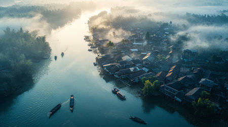 Aerial view of foggy and foggy morning in Hangzhou, China