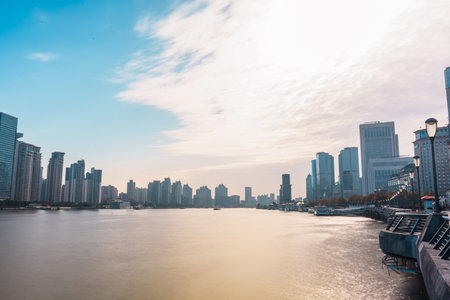 Cityscape view of Shanghai city in the morning. Skyscraper of Lujiazui in Pudong, view from The Bund of Shanghai, China. landmark and popular for tourism attractions. Travel and Vacation concept
