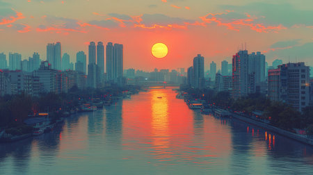 A serene cityscape at dusk, showcasing river lined with skyscrapers
