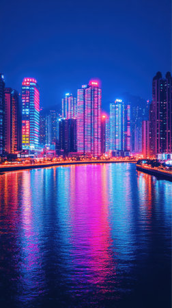 Shimmering lights adorn skyscrapers in a bustling city as night falls, reflecting beautifully on the calm river. Life thrives amidst the vivid colors and urban energy.