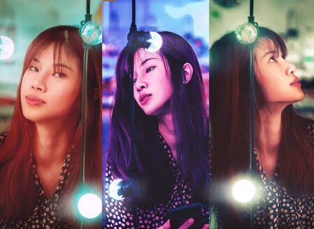 Portrait of a woman on bright Bokeh light on chair decoration in Outdoor Festive Market in Lush Lava color toned