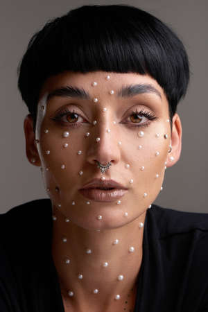 Pearls are always appropriate. Studio portrait of a beautiful young woman with pearls on her face posing against a grey background.