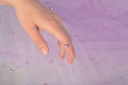 Elegant women's hand with purple fabric organza tulle mesh with pearl beads.