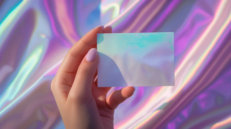 A woman's hand holds up a white card by the fingertips on the iridescent background.