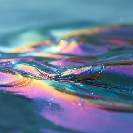 This mesmerizing image captures a colorful iridescent liquid surface adorned with glimmering droplets and sparkling highlights, perfect for artistic projects.