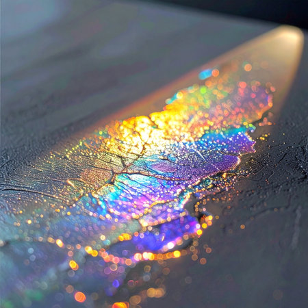 Vibrant light refractions creating a rainbow effect on a glossy surface with a bokeh background.